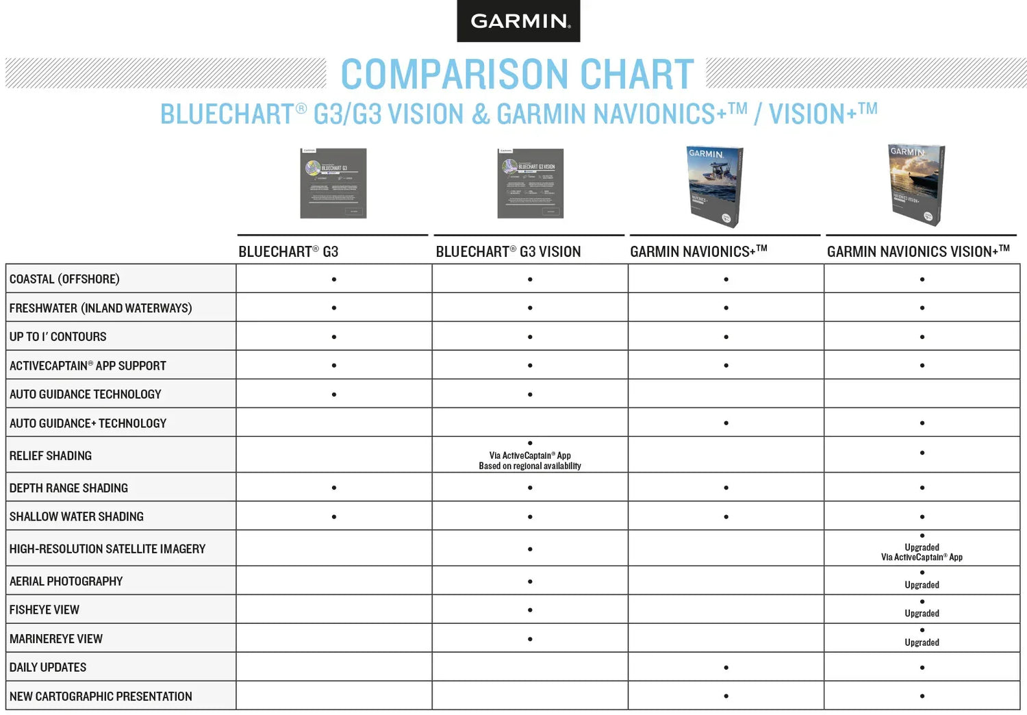 Garmin Navionics+ tai Garmin Navionics Vision+ kartan käyttö vaatii, että yhteensopivaan karttaplotteriin on tehty tammikuun 2022 ohjelmistopäivitys, joka on kätevästi esiohjelmoitu karttakorteille. Ohjelmistopäivitys on myös ladattavissa ActiveCaptain-sovelluksen tai Garmin Express™-ohjelmiston avulla.