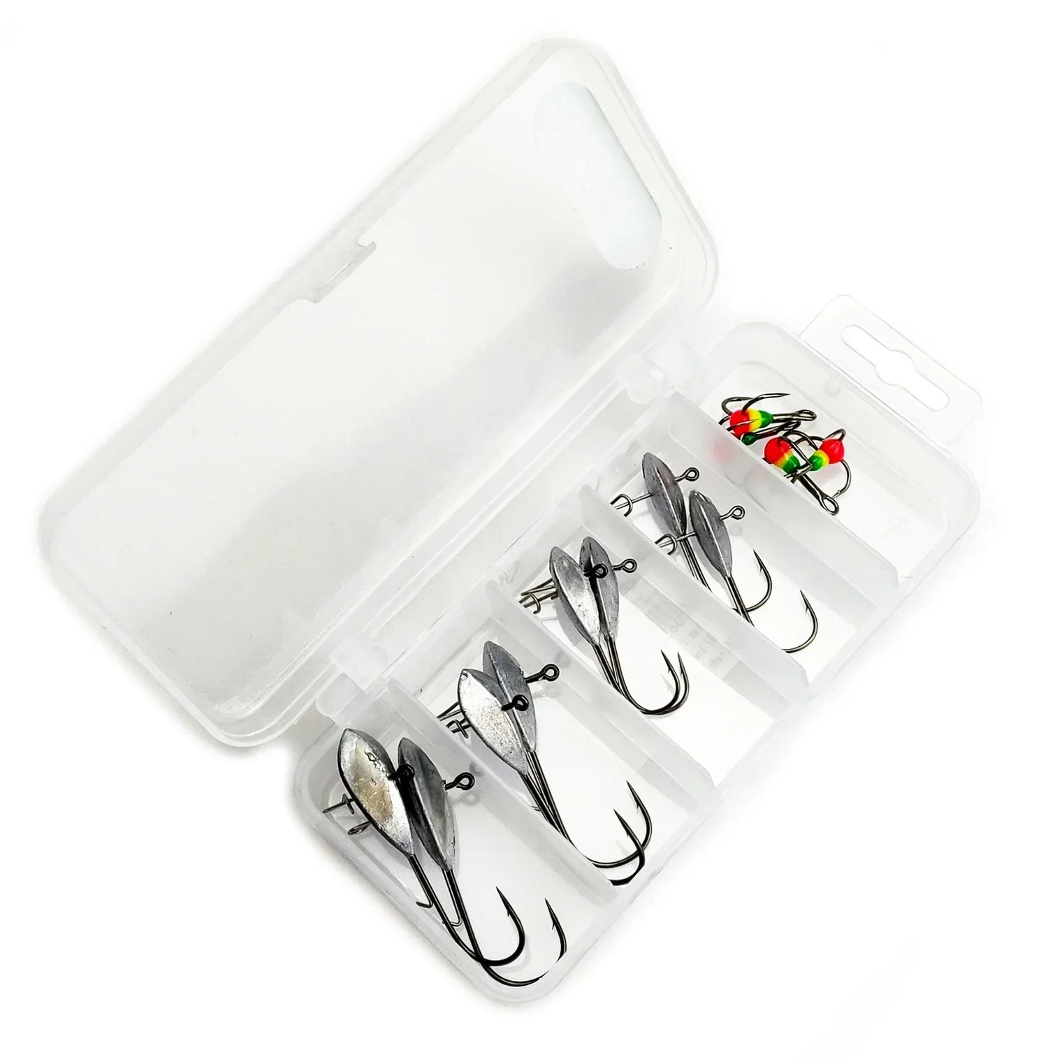 Lajitelma sisältää 4 erikokoista/painoista pilkkijigipäätä, kutakin 2kpl. Lisäksi lajitelmaan on laitettu 2 erikokoista papukaijan värityksellisellä iskupisteellä olevia kolmihaarakoukkuja molempia 2kpl. Mukana tulee kätevä säilytysrasia, jossa tuotteet pysyvät nätisti talven pilkkireissuilla. Valmis paketti, jotta sinulle jäisi vain se tärkein - pilkkiminen.
