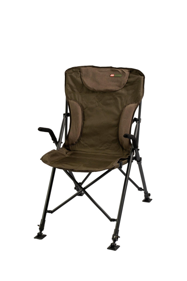 JRC Defender II Folding Chair yhdistää tukevan rakenteen ja kuljetusystävällisen koon – loistava valinta, kun tarvitset mukavan ja käytännöllisen tuolin kalareissulle.