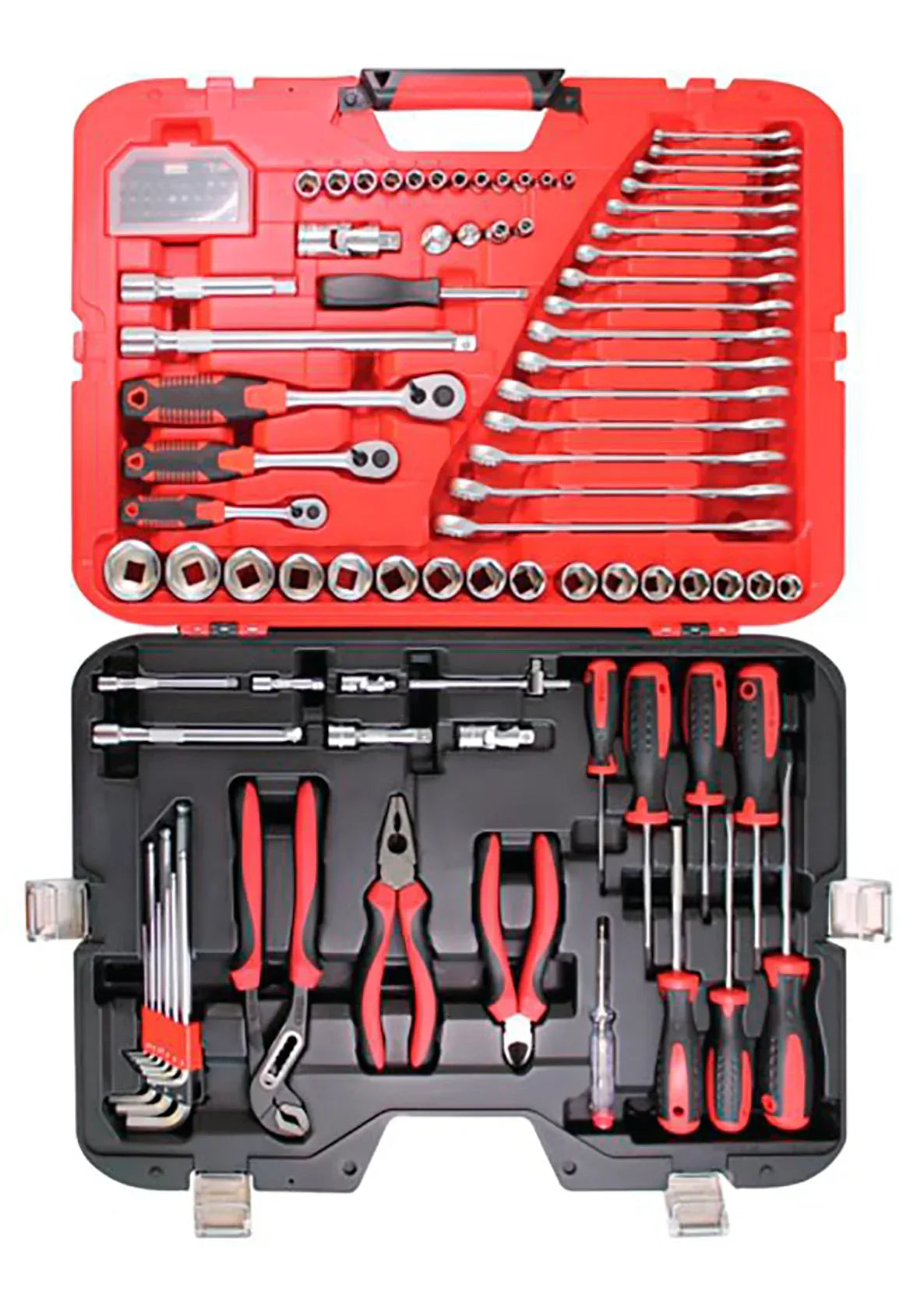 Lenkkiavainsarja ulottuu kuudesta 22 millimetriin, mutta varsinainen runsaudensarvi ovat hylsysarjat. Niitä on kolmeen eri kokoiseen räikkäavaimeen. Tämän lisäksi 30 ruuvipään erillisestä rasiasta löytyy oikea käytännössä jokaiseen kantaan.