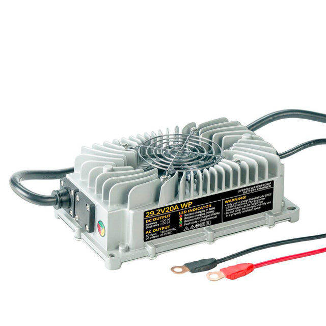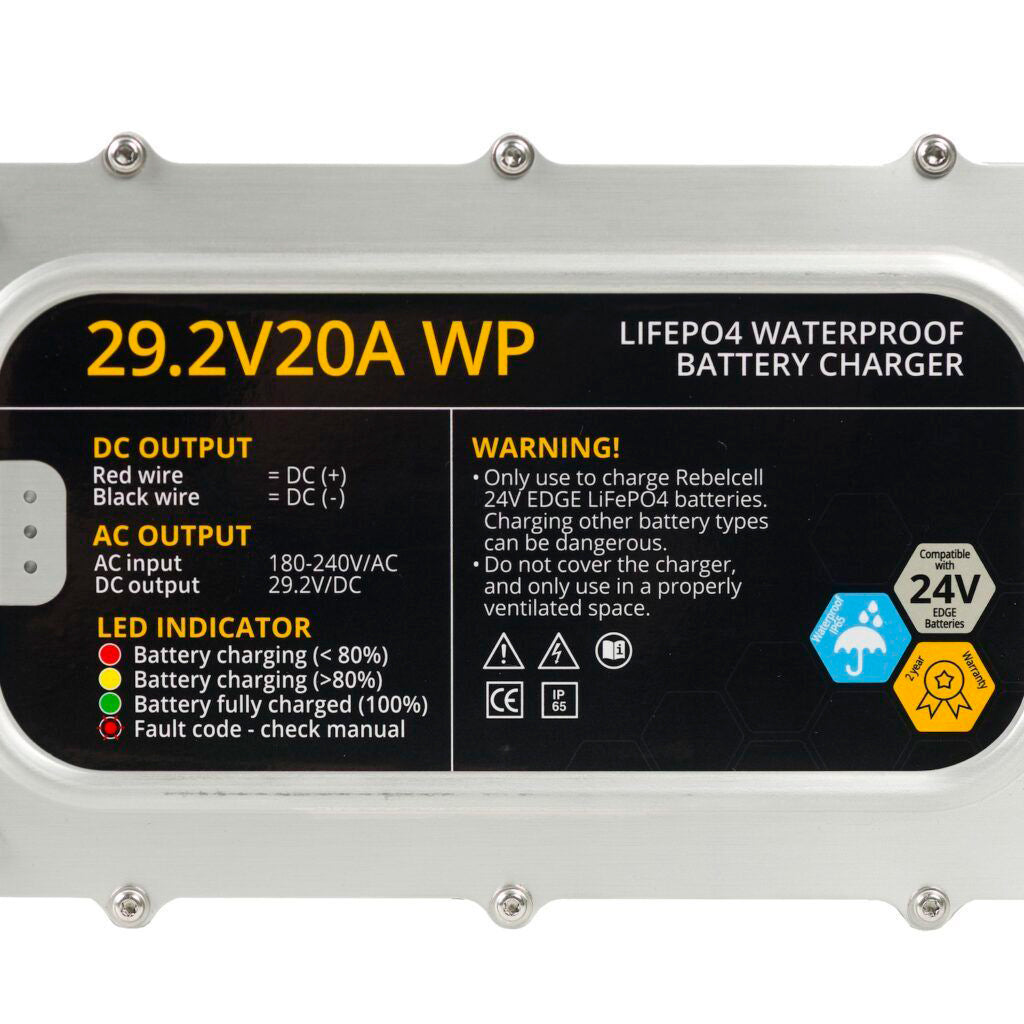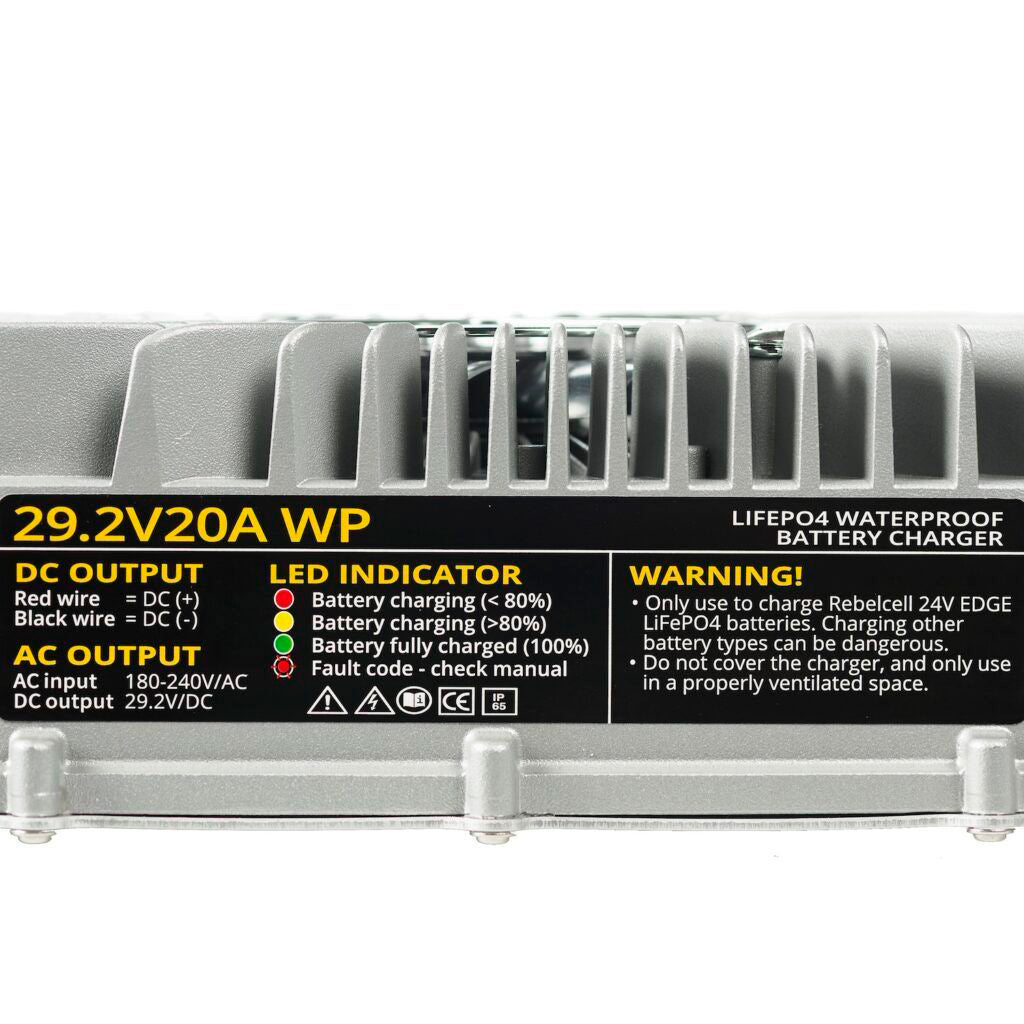 Rebelcell 29,2V 20A vedenpitävä LiFePO4 akkulaturi 24V akuille tuo varmuutta ja helppoutta 24V-akkujen lataukseen – ota laturi käyttöön ja pidä järjestelmäsi virkeänä päivästä toiseen.