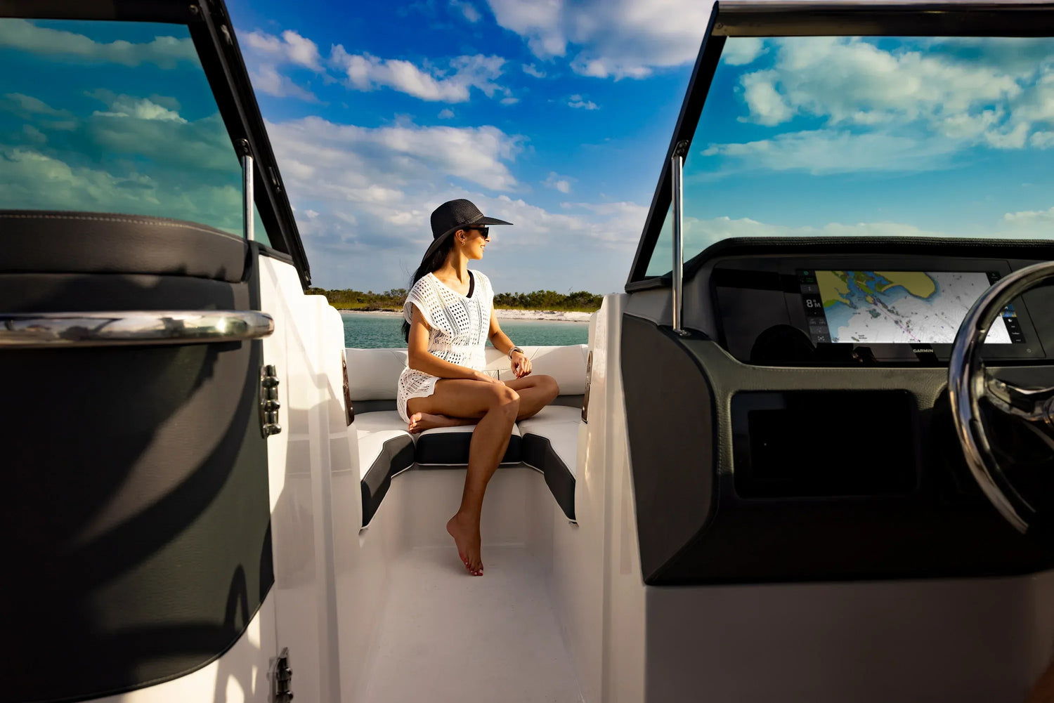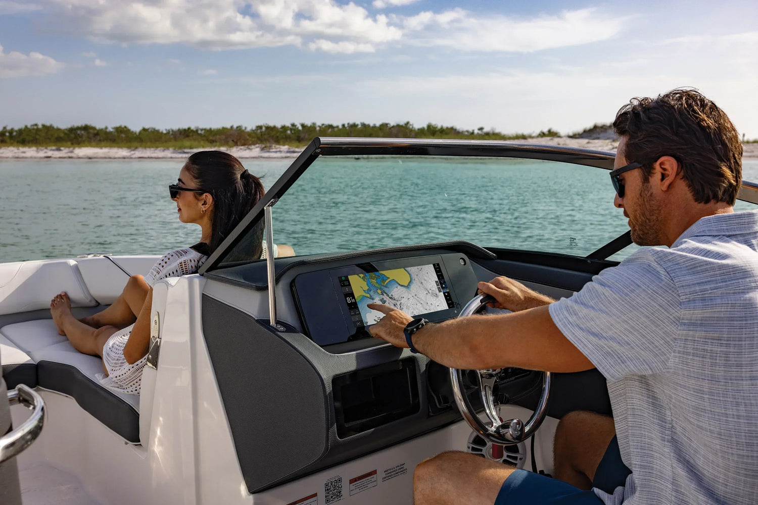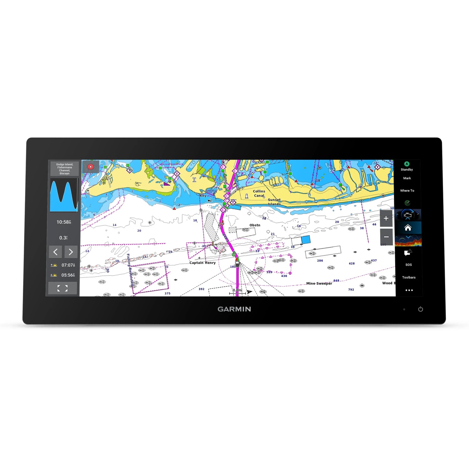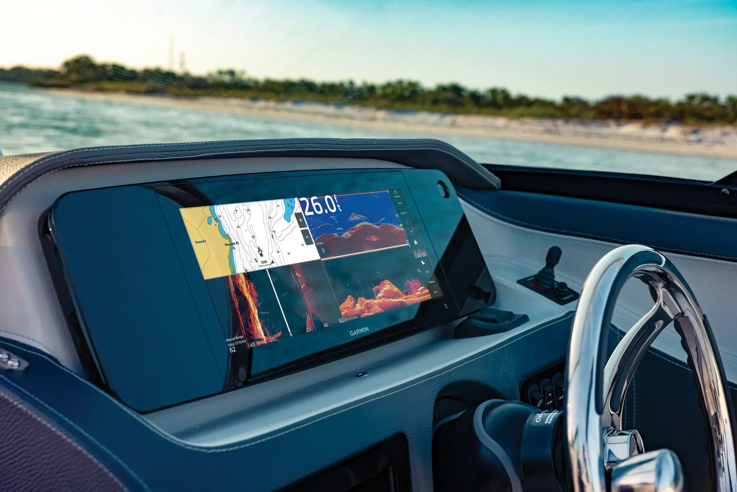 The GPSMAP 1523xsv features sleek, thin bezels and a full-glass front. Its ultra-wide, high-res touchscreen interface is consistent with the GPSMAP x3 series.